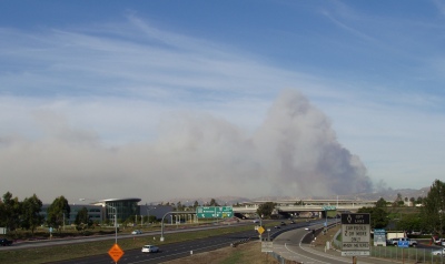 Monday morning dawned foggy. By the time we left for work, most of the fog had burned off, but we looked out the car window and saw a huge, billowing gray cloud hugging close to the ground. If this had been the usual fire season, or if there had been no fog to start with (or if there had been time for coffee to take effect), I think we would’ve both immediately recognized it as smoke from a brush fire. The Sierra fire in the Cleveland National Forest had started just a few hours earlier.