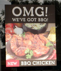 OMGBBQ Posted on August 24, 2008 by Kelson I think this was Charo Chicken. I always find it funny to see netspeak leaking into the “big blue room.” (Yeah, catching up on old weird photos.) Share This Page Related Posts:Would you believe it?Bunny XingGoin' On a Typo Hunt