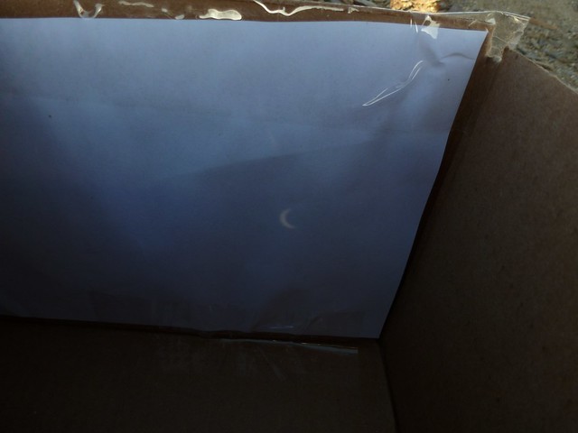 I’d cobbled together a pinhole camera the day before from two Amazon boxes, a sheet of paper, a sheet of aluminum foil, and lots and lots of packing tape. I actually started with just one box and I decided the image wasn’t big enough, so I grafted on a second. Even then it was only about 3/8″ across, but when testing it I could see the edges of clouds drifting across the sun, so I figured it would work. It did.
