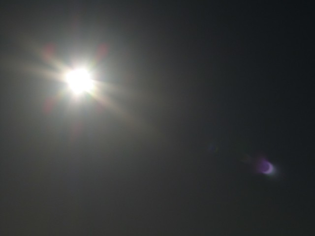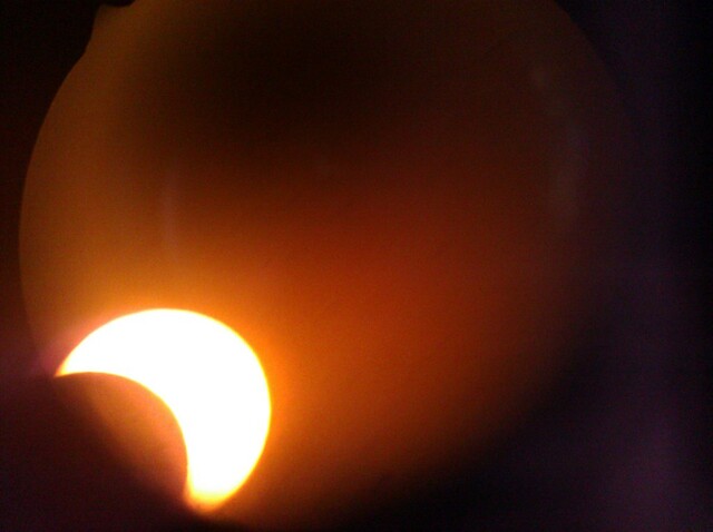 The woman whose pinhole camera ended up being used as the support for mine discovered that she could aim her iPhone a little bit away from the camera and get a fainter image of the sun in the lens flare. I was surprised that the iPhone’s lens was long enough to flare, but it also pretty much confims my suspicions about the weird lunar eclipse photo I found in a box a few years ago. Naturally, I had to try my own hand at it.