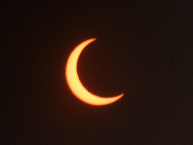 At the peak of the eclipse (what would have been totality a few hundred miles north of here), 85% of the sun’s diameter was covered. It was still too bright to look at the sun, and still broad daylight. Though it did seem dimmer, it’s hard to be certain how much of that was it being later in the day, since at 6:38 it was only about an hour before sunset.