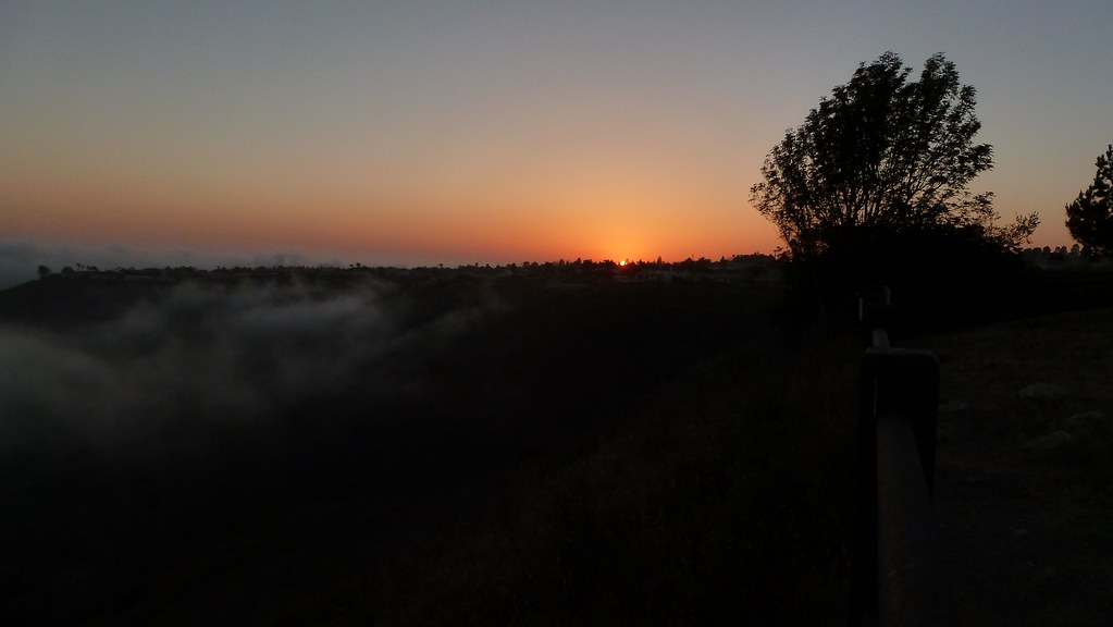 As the afternoon wore on, the fog moved inland and up the hills. When I arrived, the ridge of Catalina Island was just barely visible above a layer of clouds, and the nearby coastline was just visible below them. By an hour in, both were buried. We were starting to wonder if the fog would block the view, but it stayed well below the sun’s elevation (even if it crept up on ours).