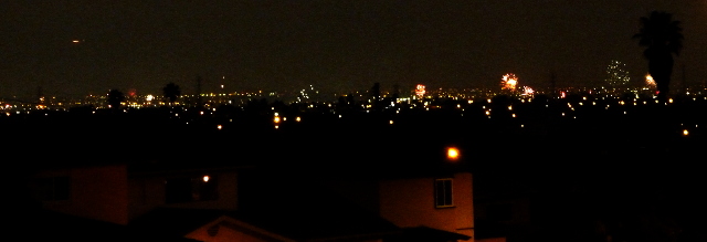 So this year we decided to just find a hillside and see what we could see. We stopped at the end of a residential street, where we could see a few other people out watching. We couldn’t see the local fireworks, but if we looked inland, we could see we could see distant fireworks displays all along the horizon.