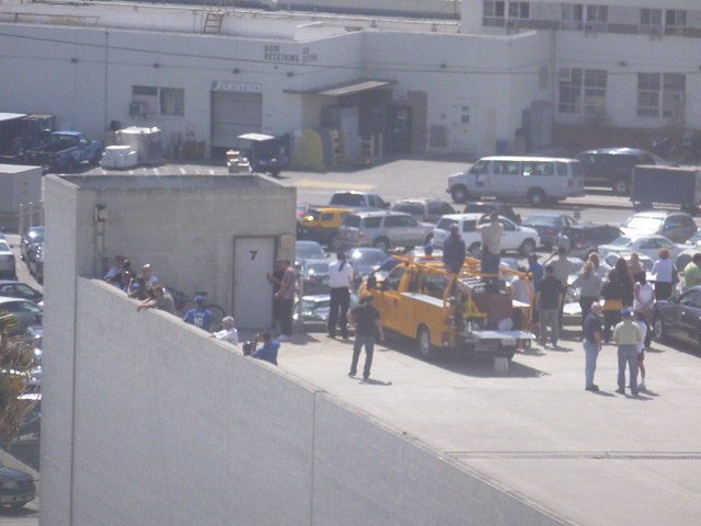 We set up by the windows with cameras, cell phones, and binoculars, straining our eyes and necks to see some sign of where it was and watching the standby helicopters for some sign of activity. We started watching the people out on the parking structure across the street, since they had a clearer view to the east than we did, and finally, the shuttle came into view.