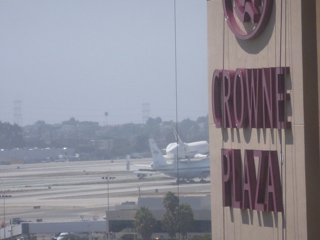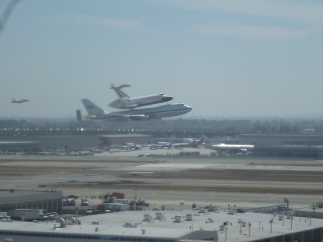 So I went back to my desk after trying to spot the shuttle in the distance through the smog (not very likely). Around 12:40, a small group of my co-workers came in, one of them saying that the shuttle had just passwed Torrance, so she was heading over to the other office suite. I glanced out the window and said, “Holy @^%#^% it’s here,” grabbed my camera, and somehow managed to snap this shot: