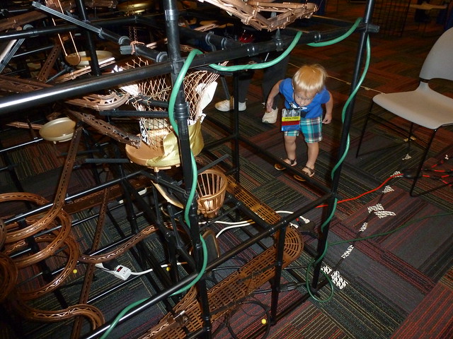 J was fascinated by the Chaos Machine. He’s too young to build track segments or add gadgets, but he had fun watching the ball bearings run along the track, picking them up, and tossing them into the machine (usually literally).