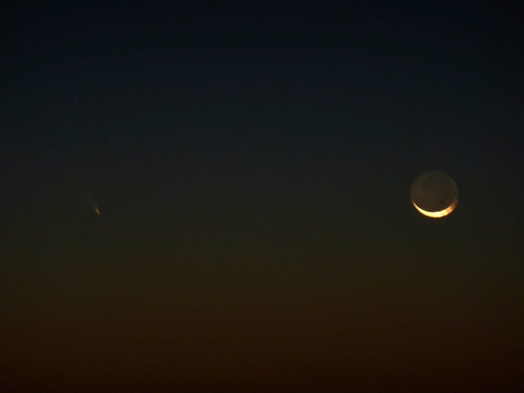 Soon, those of us with good eyesight could just barely see a faint dot, two to three finger-widths left of the moon. It did get easier to spot over the next ten to fifteen minutes, but never really resolved into any sort of shape. After a point, the darkening sky stopped helping because the comet slipped closer to the horizon.