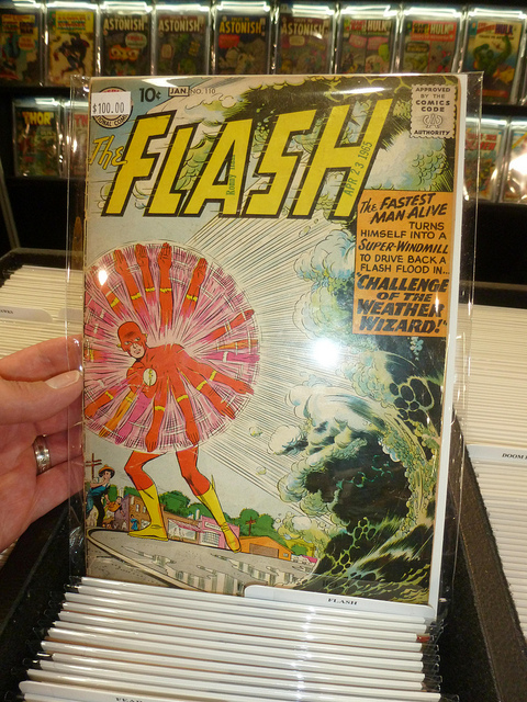 I did, however, check out some old Silver Age Flash comics. I’m more of a reader than a collector (I collect so that I can re-read), and I picked up the early stories in the Flash Archives reprints, and the not-quite-so-early stories in the cheapest, most beat-up copies that were still readable. But there’s still something about holding a well-preserved copy of a landmark issue.
