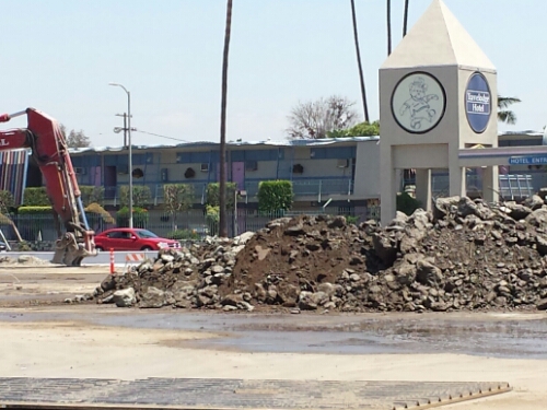 Once the bridge is fully demolished, they can start building the Metro station for the future Crenshaw Line (opening around 2019, I think). It’ll be an aerial station, built as a bridge, but the old structure was too narrow to incorporate into the new one. It’s going to keep snarling traffic for a while, I suspect, but it’ll be good for transportation once it’s completed.