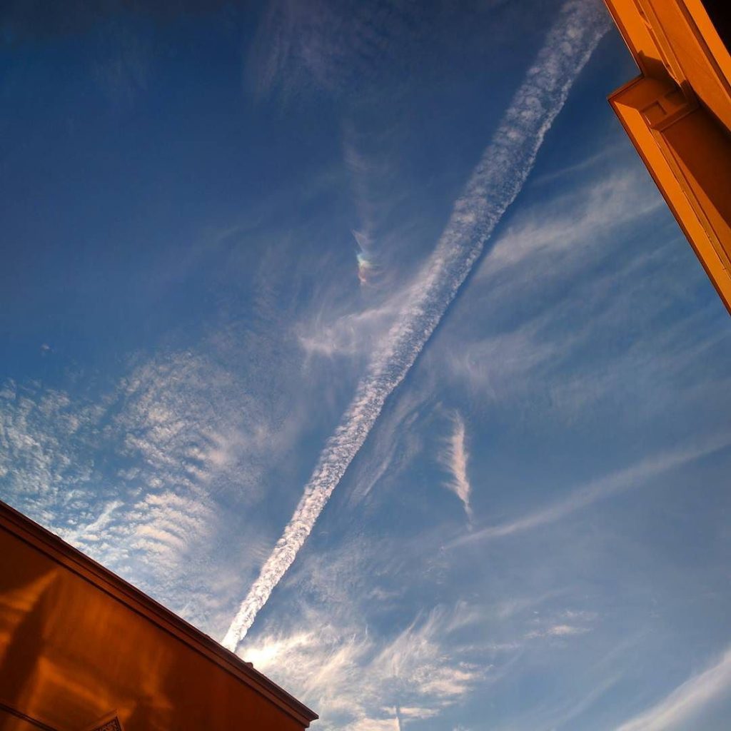 The colored wisp of cloud is too high in the sky to be a rainbow or a circumhorizon arc, and the spectrum is too ordered to be an iridescent cloud. I looked up ice halos that might produce this effect near vertical just before sunset. It turns out a circumzenithal arc is a perfect match: a rainbow arc near the zenith, brightest when the sun is very low. I’d never seen one before – it’s always cool to spot a new kind of sun halo.