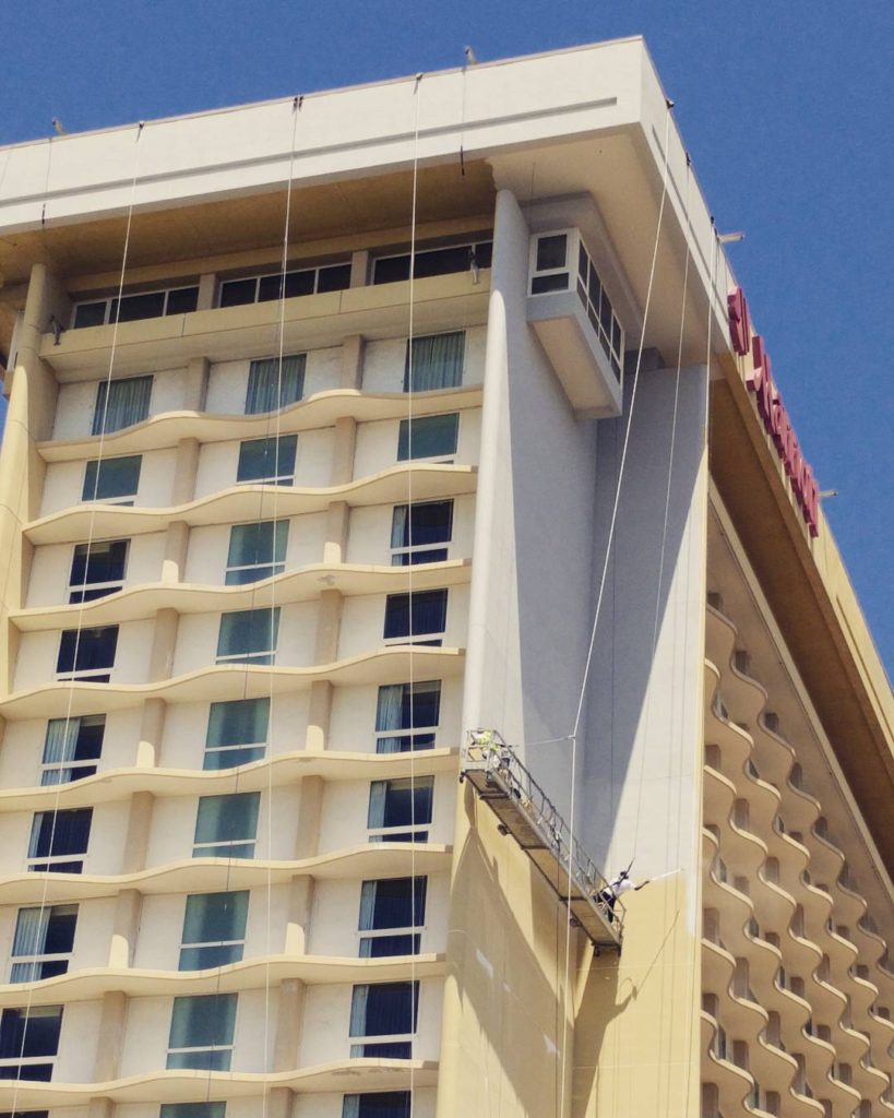 At first I couldn’t see how they kept the platform near the walls, but then I realized the most visible cables weren’t the support. They’re actually slack. They’re probably used to lower the platform over the roof, before it’s hooked up to the less visible cables hanging straight down down from the inner edge of the overhang.