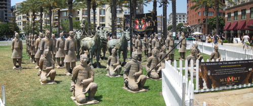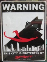 With the massive convention floor and unbelievable crowds, they’re doing everything they can to stand out. So we get the viral marketing, like the ads for TruBlood, the Humans-Only Restrooms signs, the army of people in Quarantine outfits, the Neighborhood Watch–style sign for The Spirit. We get the swag. We get the celebrity appearances. We get displays of terra-cotta warriors to advertise The Mummy and replicas of the Owlship from Watchmen.