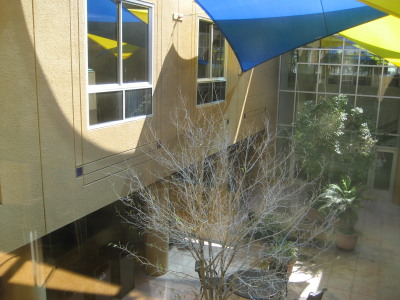 Some of the meeting rooms buried in the hill still remain from the previous building. In a food court next to the bookstore, I found a window looking down on this familiar-looking atrium.