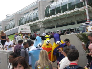 Sunday morning at Comic-Con International in San Diego. We got up early (though not as early as Katie got up on Saturday) to check out of our hotel, store our baggage, and move the car to another lot. I suspect the Sheraton would have let us keep the car there an extra day, since it was self-parking; but I’d already prepaid for Sunday through the convention, and as it turned out the other lot was cheaper anyway. Of course, since pre-paid parking was new this year, it wasn’t entirely clear what we needed to do other than leave the printout where it was visible. (More on that later.)