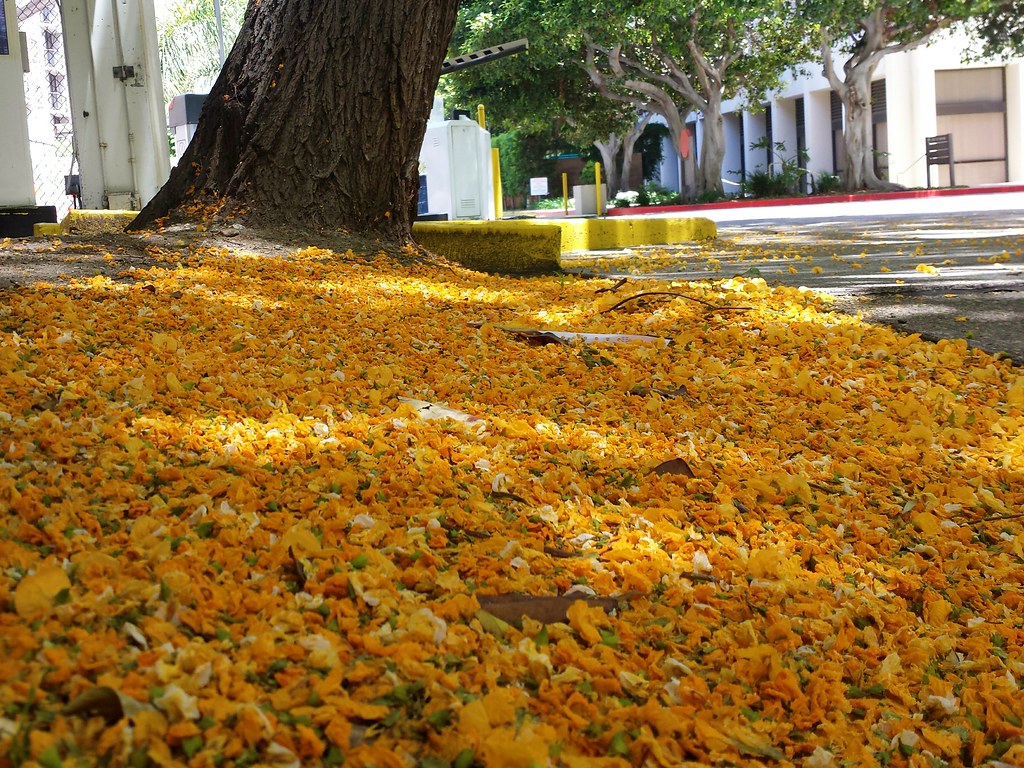 There are a lot of jacaranda trees in the area, lining the walkways through the business and hotel parks and lining the sidewalks along the street. There are also a lot of these trees, which look so similar that I assumed they were more jacarandas until the first spring I was here, when they bloomed bright yellow instead of light purple. From what I can tell, they’re Tipuana trees, also known as Pride of Bolivia trees, and despite the similarities, they aren’t closely related.