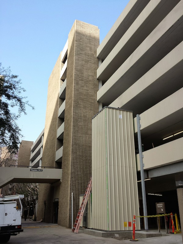 …But look back up there at the photo. The top of the new column is anchored to the third floor, meaning this elevator only goes up to the second. So if you’ve parked on the fifth floor, you need to take an elevator down to the second, get out, walk around the corner, and take another elevator down to the first.
