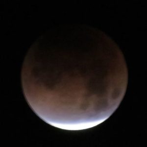 I woke up way too early to see if the Super Blue Blood Moon* eclipse would be visible or blocked by clouds. (You never know, and I didn’t want to wake up the kiddo in the middle of a school night if there wasn’t anything to see.) I had a clear view, but the street lights were too bright to see the red color. It just looked dull brown.