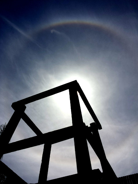 I spotted this great halo yesterday while we were out shopping for plants for a vegetable garden. The bright, colorful upper arc just jumped out, and while I searched for something I could use to block the sun for a photo, I also shaded my son’s eyes with my hand so he could look too.