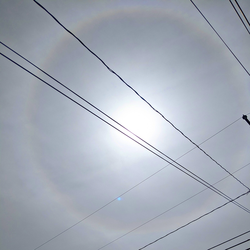 A full 22-degree circular halo spotted today, caused by sunlight refracting through ice crystals in the thin cloud layer. (It was around 65F at ground level.)