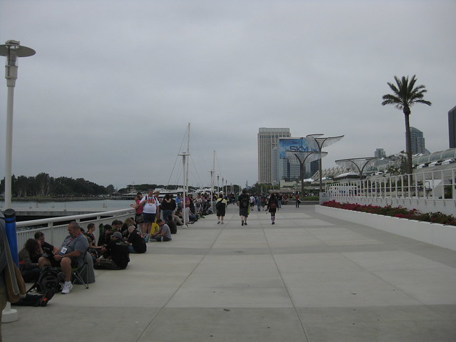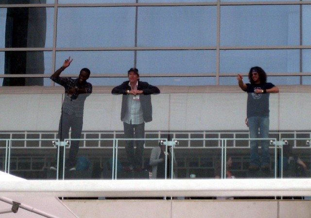 As I neared the front of the outdoor section of the line, a shout went up, and people started waving up at the balcony. It was hard to see in the gloom, but several of the actors were out on a balcony. Tim Hutton (Nate Ford), Aldis Hodge (Alec Hardison), and Christian Kane (Elliot Spencer) started waving back, and as we took pictures of them, they took pictures of the line. Meanwhile, the Venture Brothers fans were wondering just who the heck was up there.