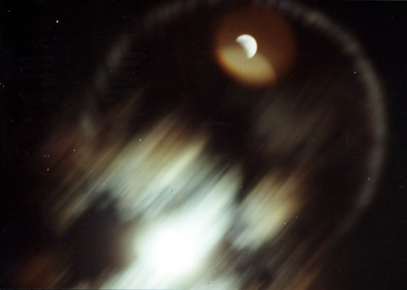 I’m not sure, but I think the bright splotch near the bottom is actually the moon, and the clear image of the moon up near the top is a reflection inside the camera. I have no idea whether the ring is an atmospheric phenomenon that got picked up on the film, or just lens flare.