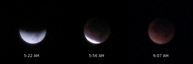 The last time a lunar eclipse was visible in our area, I woke up at ridiculous-o’clock in the morning and went out to watch, first across the street, then trying to find a clear view in the west before sunrise and moonset drowned everything out.