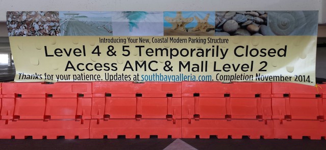On the plus side, they did build a parking structure big enough for a full mall, which means that it’s available for event parking. Of course, even the parking structure is unfinished. I took this photo four years ago, and the top floor still looks like this — chain link, sandbags, exposed rebar and all.