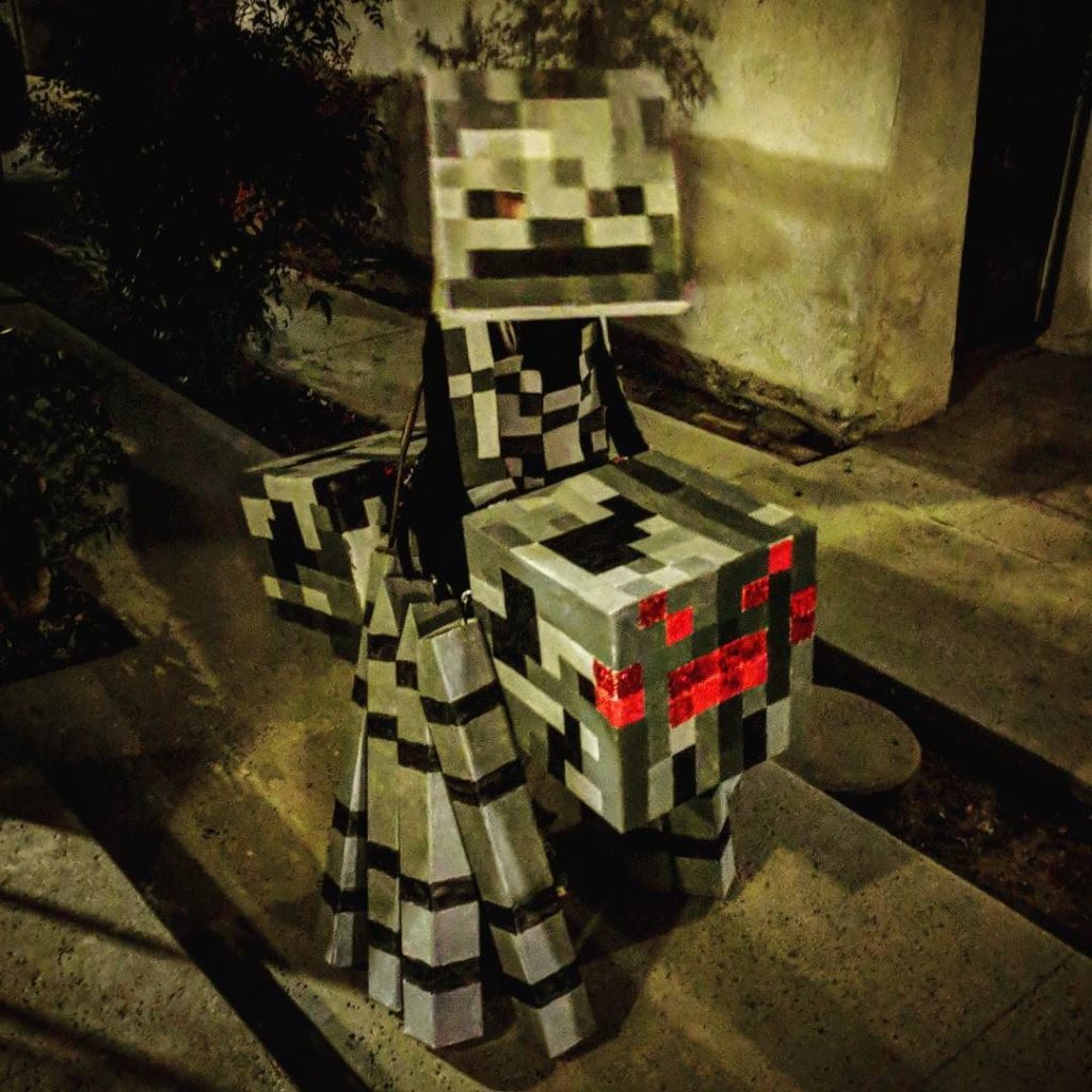 Homemade spider jockey costume (a composite Minecraft monster consisting of a skeleton archer riding a giant spider). Kid-sized, built by Katie (I assisted, mainly with painting, but the design, planning, and most of the construction was her).
