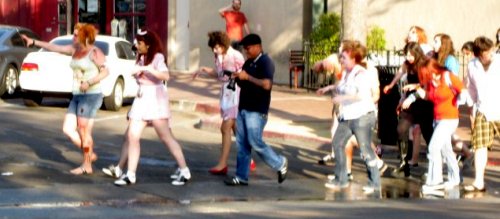Saturday night we met up with my parents after the con for dinner. On the way to the restaurant, Chopahn — very good Afghan food, another one we’d definitely recommend — a mob of people made up as zombies came shambling up the street. We decided to hang back and wait for them to pass.