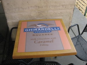 We took in about 3/4 of the aquarium during the rest of the morning and early afternoon, then went looking for lunch in Cannery Row. We ended up at a crepe place near where we parked, which wasn’t terribly good (they used pre-made crepes and some of the fillings that should have been hot were still cold when they were served), then went over to the Ghirardelli shop. Because ever since they closed the shop in South Coast Plaza, I can’t go to a city with a Ghirardelli shop and not go there. (Seriously, that was the way I could handle the stress of shopping in South Coast Plaza.) I had the Mint Bliss sundae. Katie just had the square of chocolate that they put on the sundae. And it was seriously good. Also, check out the picture of one of the tables they had outside.