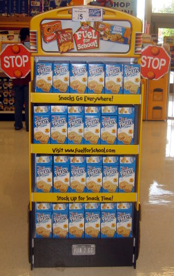 Spotted this in mid-August, during the height of Back to School sales. It’s a school bus-shaped display with shelves on the sides and back. Katie’s fairly certain that the other shelves weren’t all Rice Krispies treats — they were Pop Tarts and the like.