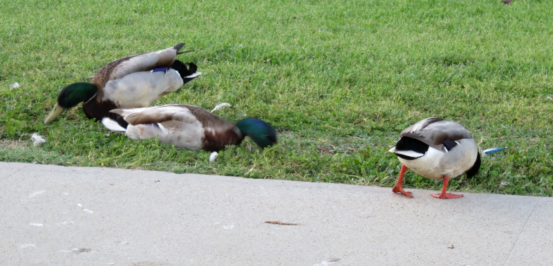 While some cities around here have only closed playgrounds and sports facilities at their parks, Manhattan Beach has closed their parks outright. Polliwog Park has a large pond year-round that attracts ducks, geese, coots, herons and more, plus the local gulls and pigeons that wander by. But the park has been literally wrapped in caution tape for a month, and the ducks that normally stay in and around the pond have come out to the edges by the sidewalks — where people can still walk by and feed them.