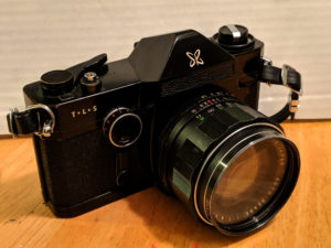 The 7YO was looking through the closet the other day and found my old camera bag. Inside it: the old film SLR camera that my grandfather gave me when I was around 12. It’s older than I am, a Sears camera that appears to be a rebranded Ricoh Singlex TLS from 1967. It’s completely manual except for the light meter.