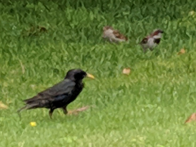 After several days not being able to see any of the birds I could hear when I went for a walk on break from work, I saw a whole bunch of them hanging out on a lawn, eating seeds or bugs or whatever it is that these particular birds eat. Of course since I’d been walking to lunch, the only camera I had with me was my phone. No optical zoom, and I couldn’t get too close without spooking them. I figured what the heck, I’d give it a shot (or several) with the phone and see if I got something clear enough to post to iNaturalist.