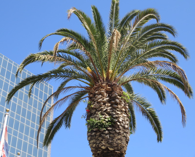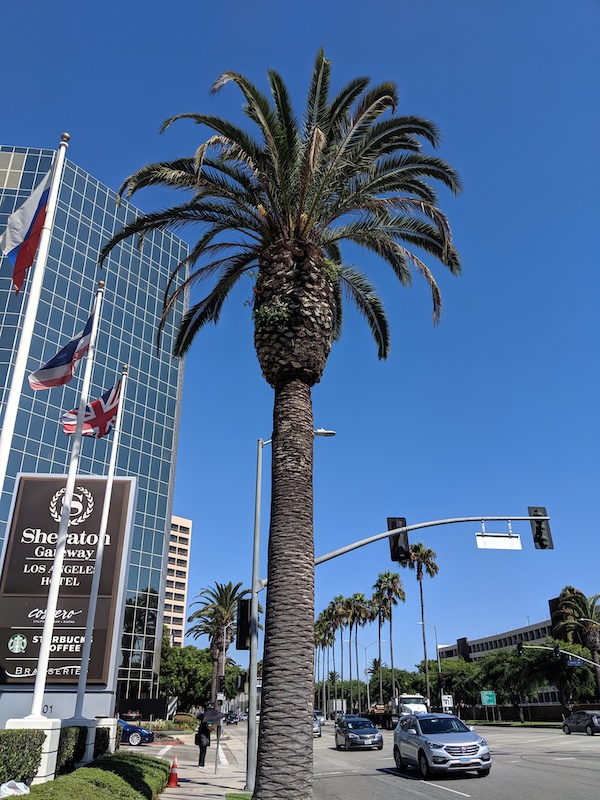 Update Sep 13: Found a notice pinned to all the trees along this edge of the block: The construction project for the LAX people-mover wants to take them all out.