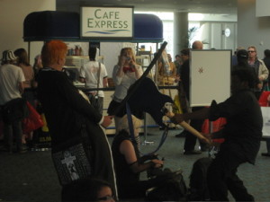 Today was the day for running into people. On my way from Image (with the Tori book) to Studio Foglio, I ran into a group from Comic Quest (the local comic store I go to on Wednesdays). I ran into my mom at the Connie Willis panel. We met up with our friend Sean at lunch, and I ran into our friend Wayne after Final Crisis…because Katie had spotted a Minbari, and I went over to take his picture. Ten feet away, there was Wayne.