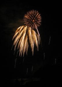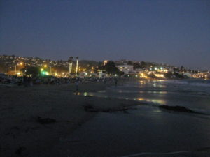 The wind was good, blowing the smoke parallel to the beach and keeping the view of the fireworks clear. (A few years ago, it lingered, so after a few minutes we got to see smoke lit up in pretty colors.) Every once in a while, I’d look behind to see the moon and the fireworks from the next display along the coast the other way (Dana Point?), barely visible in the distance.