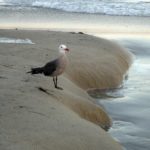 Around 7:30 we staked out a spot on the beach, which was already crowded. At the time we got there, the daytime beach-goers were just leaving, while the fireworks crowd was just arriving. I kicked off my shoes and waded out into the surf a bit, taking pictures of seagulls and scenery.