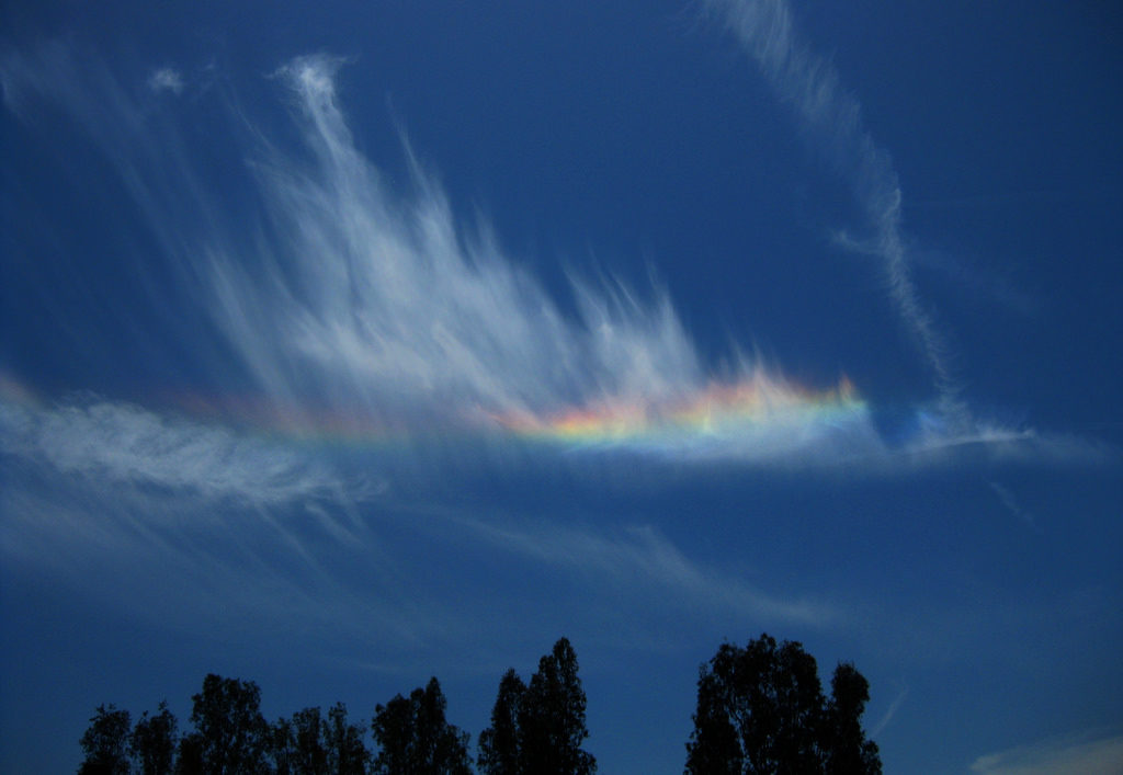 At the right angle, ice crystals in a cirrus cloud refract sunlight to produce a feathery rainbow effect. The circumhorizon arc runs parallel to the horizon, and while it can be long, it’s usually only seen in fragments like this. I’ve only seen a few of these myself, and it’s been years since I’ve seen one this intense. I took this photo through my polarized sunglasses, but the colors were bright even without them.