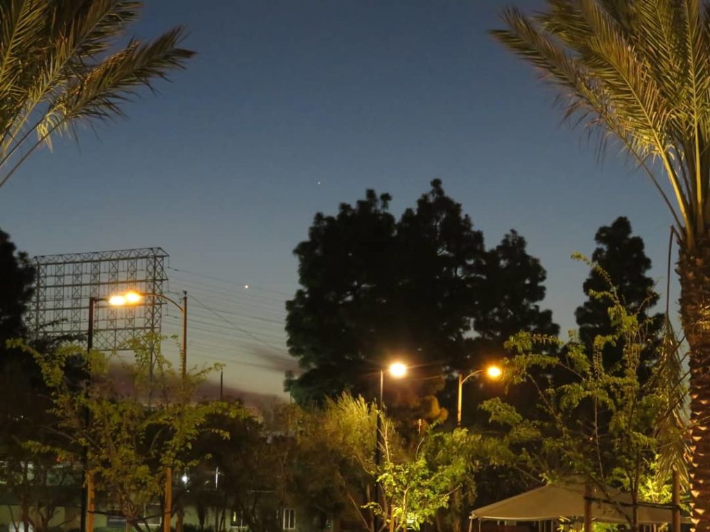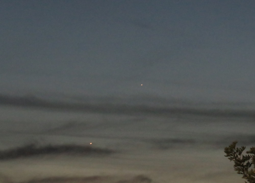 Dark blue sky, blurry bushes off to the right. In the middle of the sky are two bright spots right next to each other, the right one noticeably brighter.